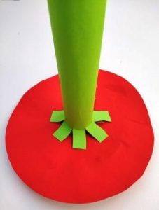 Wenn ihr dies gemacht habt, nehmt ihr die Papprolle und klebt die Laschen auf den Pappteller. Ihr braucht viel Kleber damit es hält und ihr müsst den Kleber gut trocknen lassen. Wenn es gar nicht halten sollte, könnt ihr die Laschen zusätzlich noch mit Tesafilm am Teller festkleben.