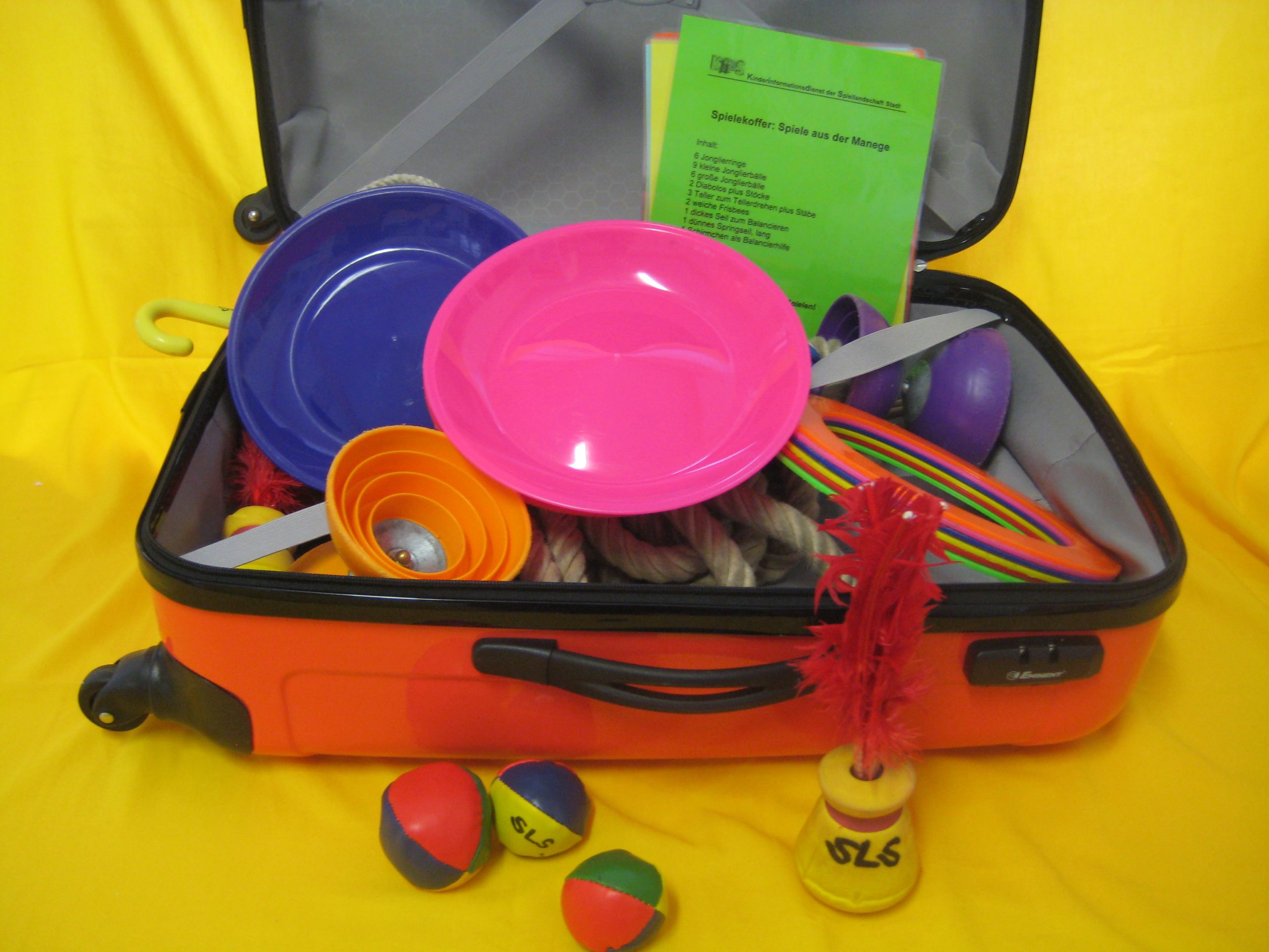 Als Ergänzung zum ZIRKUSKOFFER eignet sich der Koffer SPIELE AUS DER MANEGE. Darin befinden sich Spielgeräte für Akrobaten: Jongliermaterial, Diabolos, Teller und Stäbe zum
