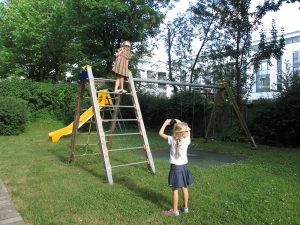 Fanny (6) und Louisa (5) sind auf das Gerüst geklettert. Sie finden die Aussicht von dort oben prima!