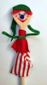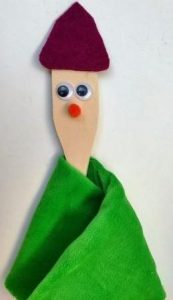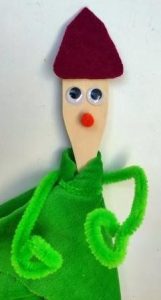 Wenn ihr Lust habt könnt ihr eurer Kochlöffelpuppe noch einen Hut oder eine Mütze ausschneiden und aufkleben. Weiter unten seht ihr eine Zipfelmütze. Dafür müsst ihr ein langgezogenes Dreieck mit einer ganz spitzen Spitze ausschneiden und zusammen kleben. Jetzt könnt ihr noch Arme mit einem Pfeifenputzer an eurer Puppe festdrehen.