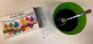 Danach nimmst du deine Lebensmittelfarbe. Wenn sie nicht schon flüssig ist, löst du sie in Wasser auf.