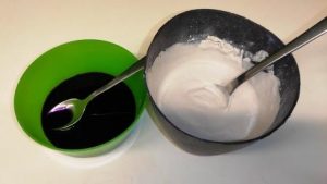 Dann nimmst du das Gipspulver und tust davon einiges in die Schüssel und rührst den Gips mit deiner Lebensmittelfarbe an. Der Gips darf nicht zu flüssig sein, er muss sich aber noch aus der Schüssel gießen lassen können. Du kannst entweder mehr Gipspulver dazu tun, wenn es zu flüssig ist oder mehr flüssige Lebensmittelfarbe, wenn das Ganze noch zu dickflüssig ist.