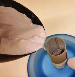Wenn die Masse die richtige Konsistenz hat, gießt du das Ganze in deine vorbereitete Toilettenpapierrolle. Am besten stellst du alles auf einen Teller damit, wenn etwas vorbei läuft, du es leichter sauber machen kannst.