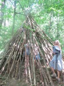 Im Südpark entdeckten die Forscherinnen Katharina (9), Selma (7), Charlotte (9) und Paula (9) ein selbst gebautes Tipi aus Stöcken.