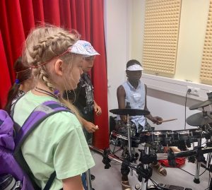 Besonders interessant fand unsere Forschergruppe den Musikraum. Dort sind die Wände mit Schaumstoff verkleidet, damit es weniger hallt und man gute Tonaufnahmen machen kann. Es gibt im Trafixx mehrere Gitarren und Bässe und auch ein elektronisches Schlagzeug.