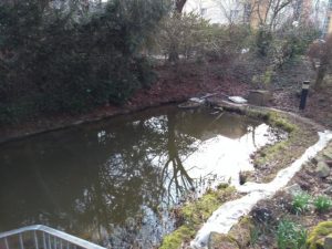 Hier gibt es einen kleinen Teich mit Garten und einen kleinen Brunnen zwischen Büschen und Bäumen.